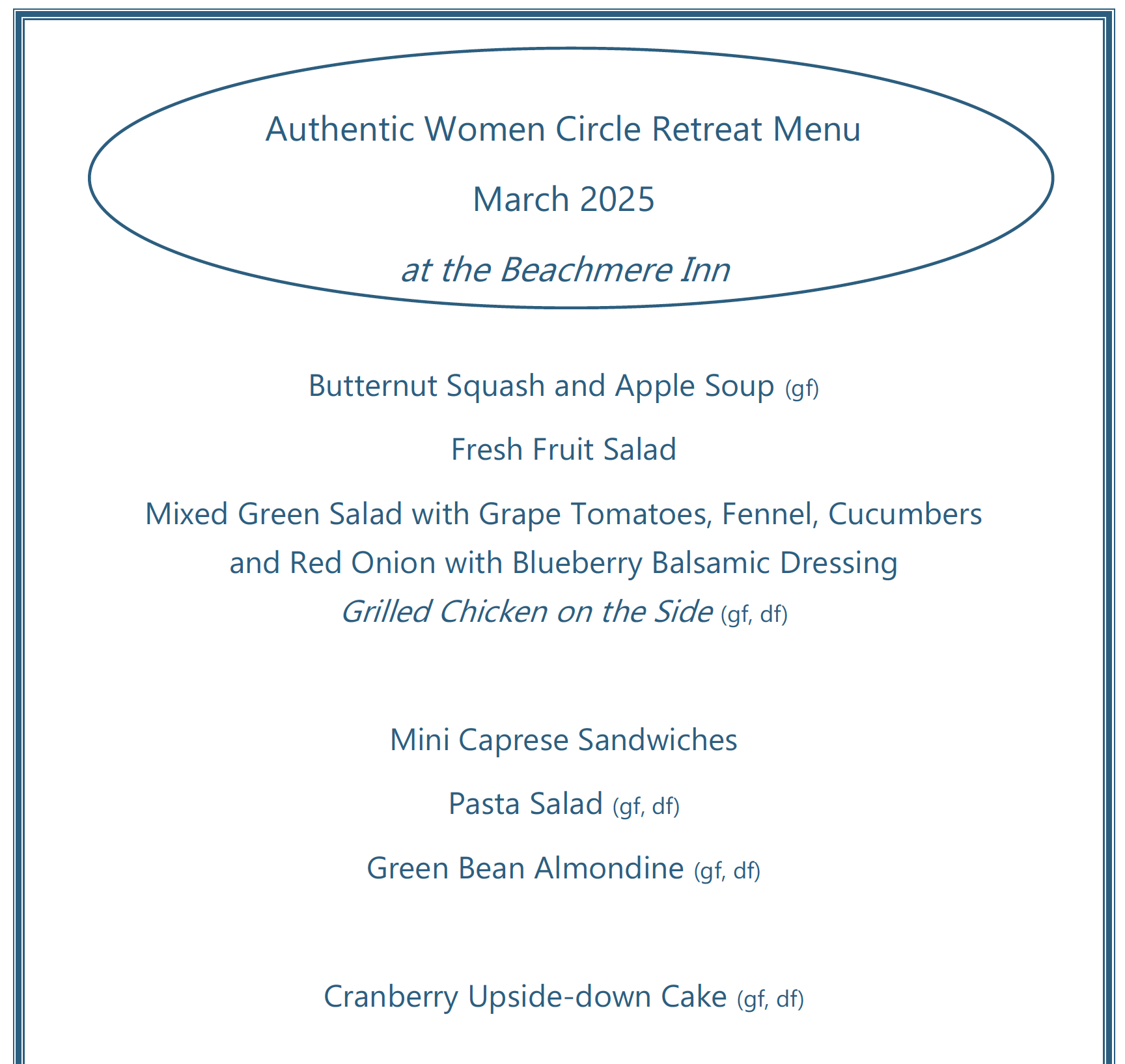1. The women of the Authentic Women Circle are so fortunate to have you begin a new chapter in the life of the Women’s Center for Wellness. I will join as an out-of-state member and, perhaps, get a chance to participate in some events and the annual retreat. Miss it so!